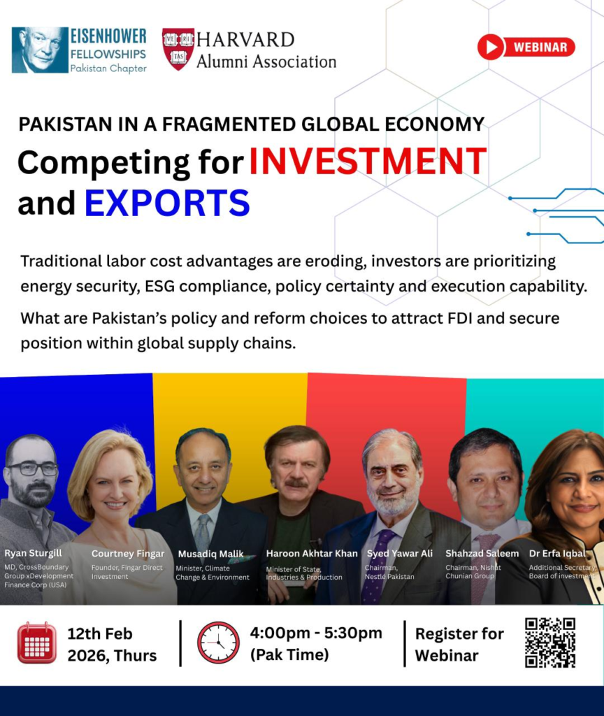 A high-profile webinar titled “Pakistan in a Fragmented Global Economy: Competing for Investment and Exports,” organized by the Eisenhower Fellowships Pakistan Chapter in collaboration with the Harvard Alumni Association, aims to shed light on these critical issues. Scheduled for February 12, 2026, the session will feature a diverse panel of influential speakers from both the public and private sectors, offering insights into Pakistan’s strategic choices for economic growth and international trade.
